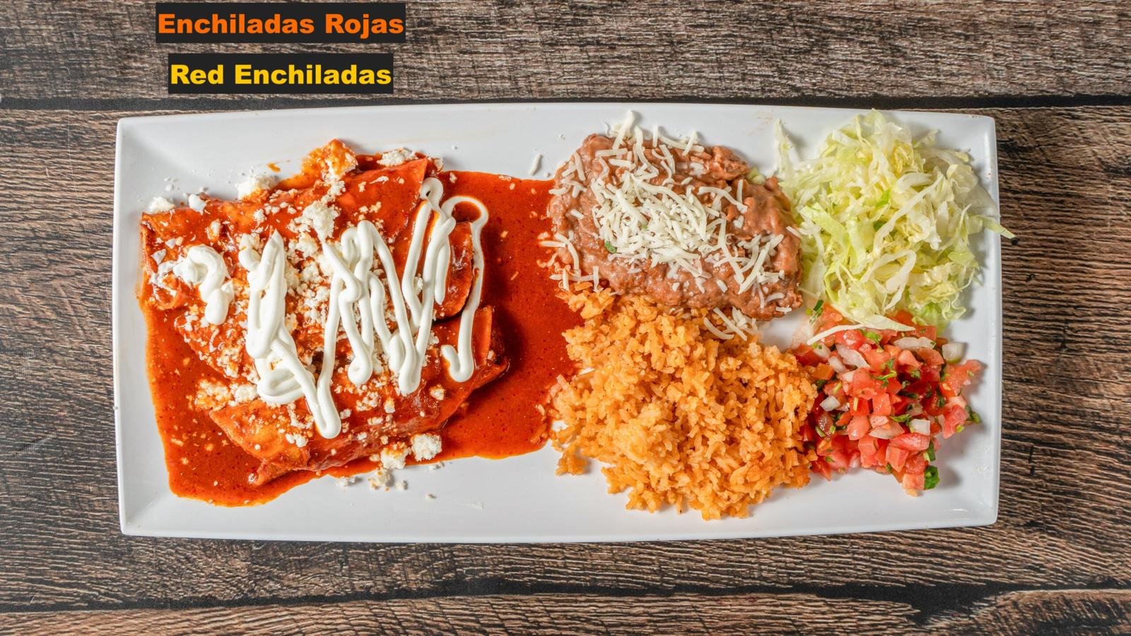 3 Cheese Enchilada Plate$14.99 3 Cheese Enchilada Plate quantity Add to cart Order Now Category: PLATILLOS Description Enchiladas with red/green sauce, rice, beans, sour cream, lettuce, cheese Related products Chile Relleno Plate $14.99 Add to cart Order Now Carne Asada Plate $19.99 Add to cart Order Now Carnitas Plate $16.50 Add to cart Order Now Chilaquiles Plate $13.50 Add to cart Order Now